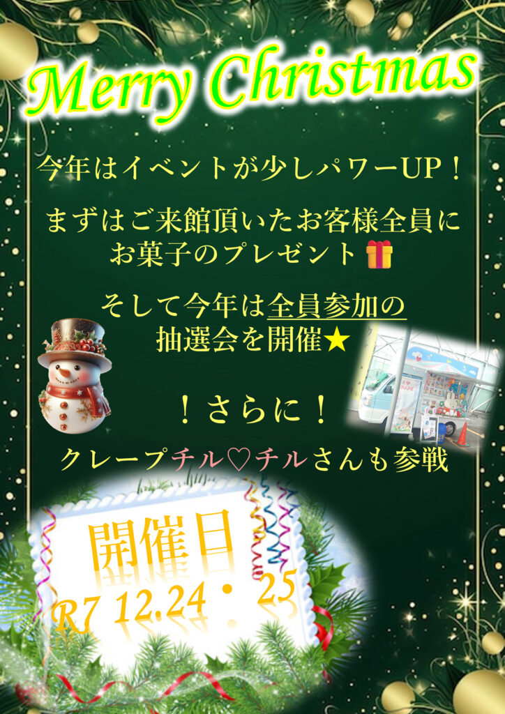 今年は少しパワーUP!ご来館頂いた皆様へのプレゼントに加え、今年の『クリスマス抽選会🎁』は、お客様全員が参加できます⭐ぜひお楽しみ下さい!さらに、今年のクリスマスはおなじみの“クレープチル♡チル”さんが出店してくれます💛ケーキも楽しみだと思いますが、美味しいクレープもいかがでしょうか?