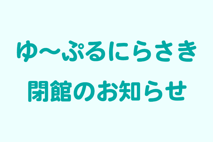 ゆ~ぷるにらさき 閉館のお知らせ 2026年3月20日 お知らせ 当施設は、令和8年 3月31日(火)の営業を持ちまして閉館となります。 市民及び利用者の皆様におかれましては、長年にわたりご利用いただきありがとうございました。 Share: Older Post ゆ~ぷるにらさき バレンタインのお知らせ!
